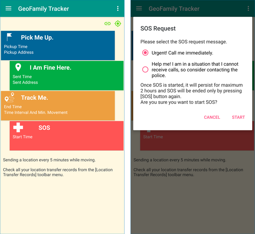 In a pressing situation where the tracker app user does not have time to launch the app, an SOS request will be sent to the controller app user and SOS mode will start by pressing the power key on the side of the phone several times in quick succession.